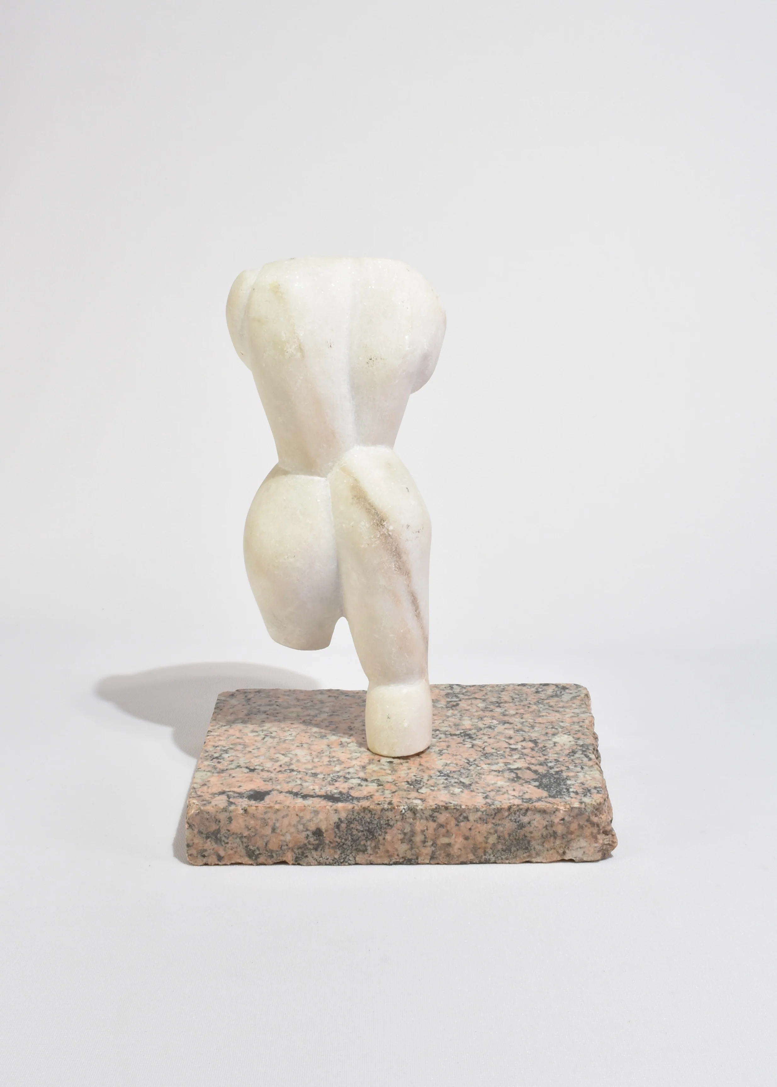 Carved stone torso in smooth white marble with stylized, angular curves and softened edges. The figure rests on a substantial speckled granite base in tones of pink, grey, and black; base is removable.