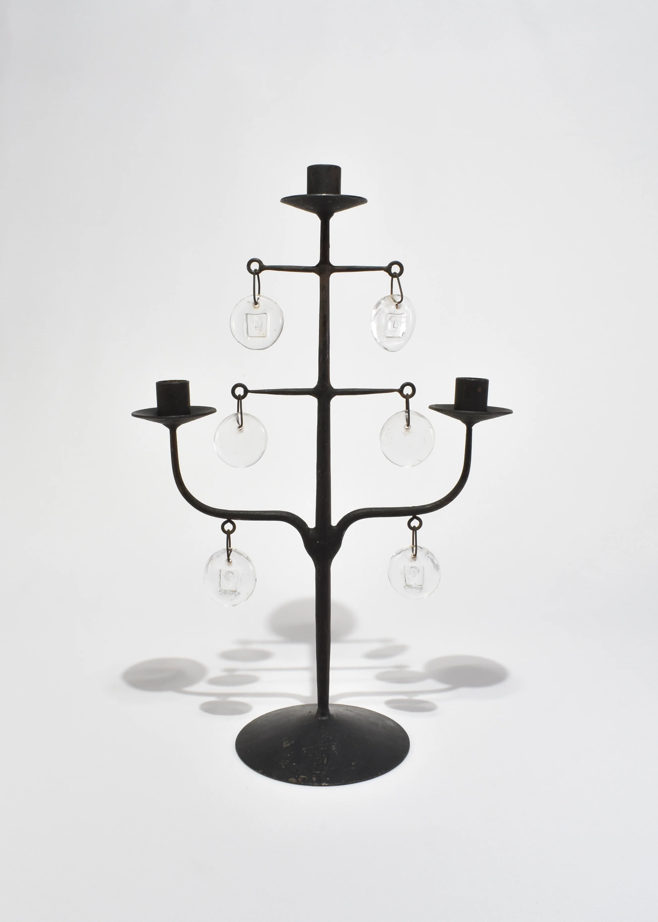Mid-century wrought iron candelabra with three candle holders and suspended clear glass drops. Designed by Erik Höglund for Boda, Sweden. Sculptural form with circular base and symmetrical arms.