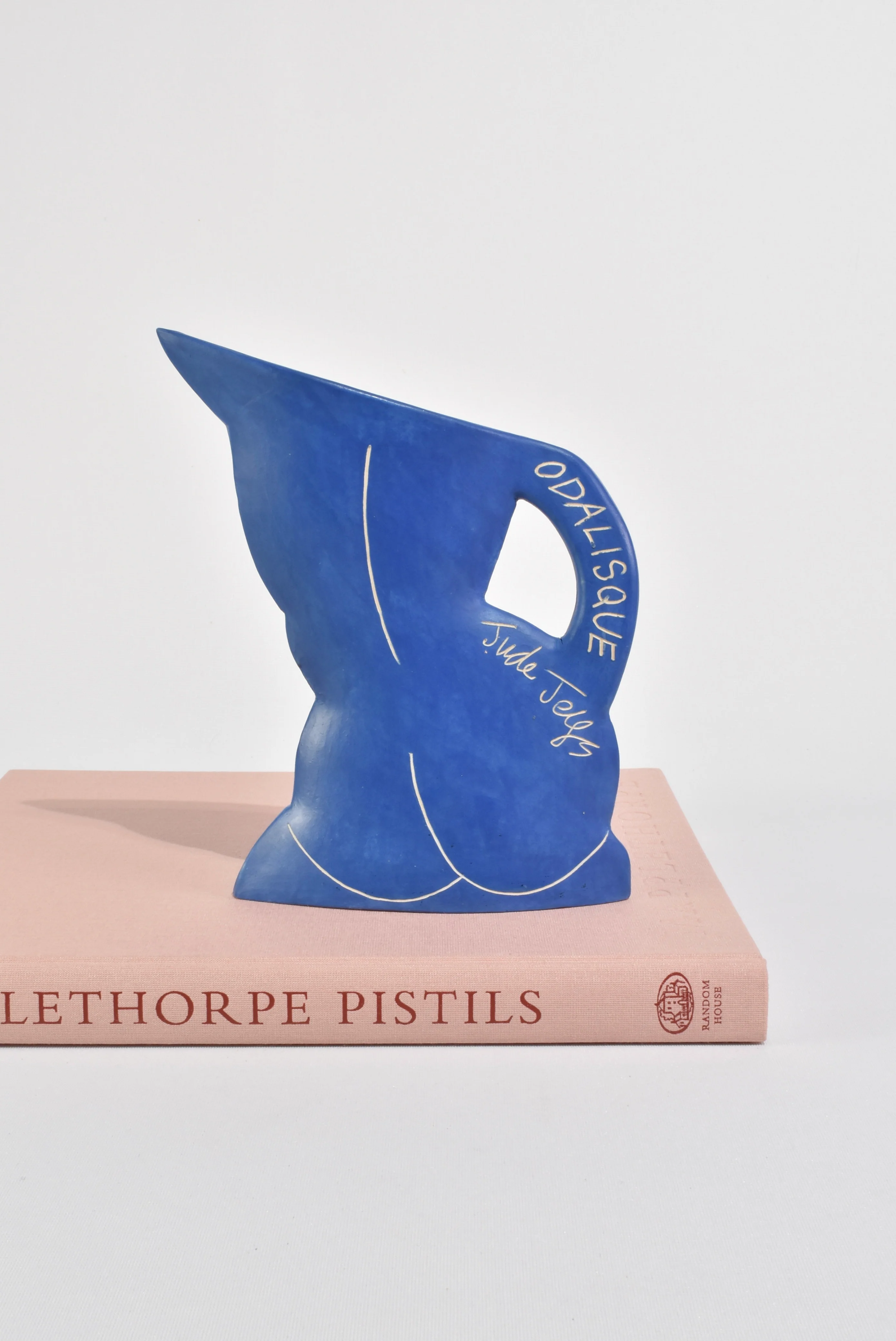 Blue female nude form ‘Odalisque’ by Jude Jelfs. Slab-built earthenware with vitreous slips and sgraffito. Glazed inside.