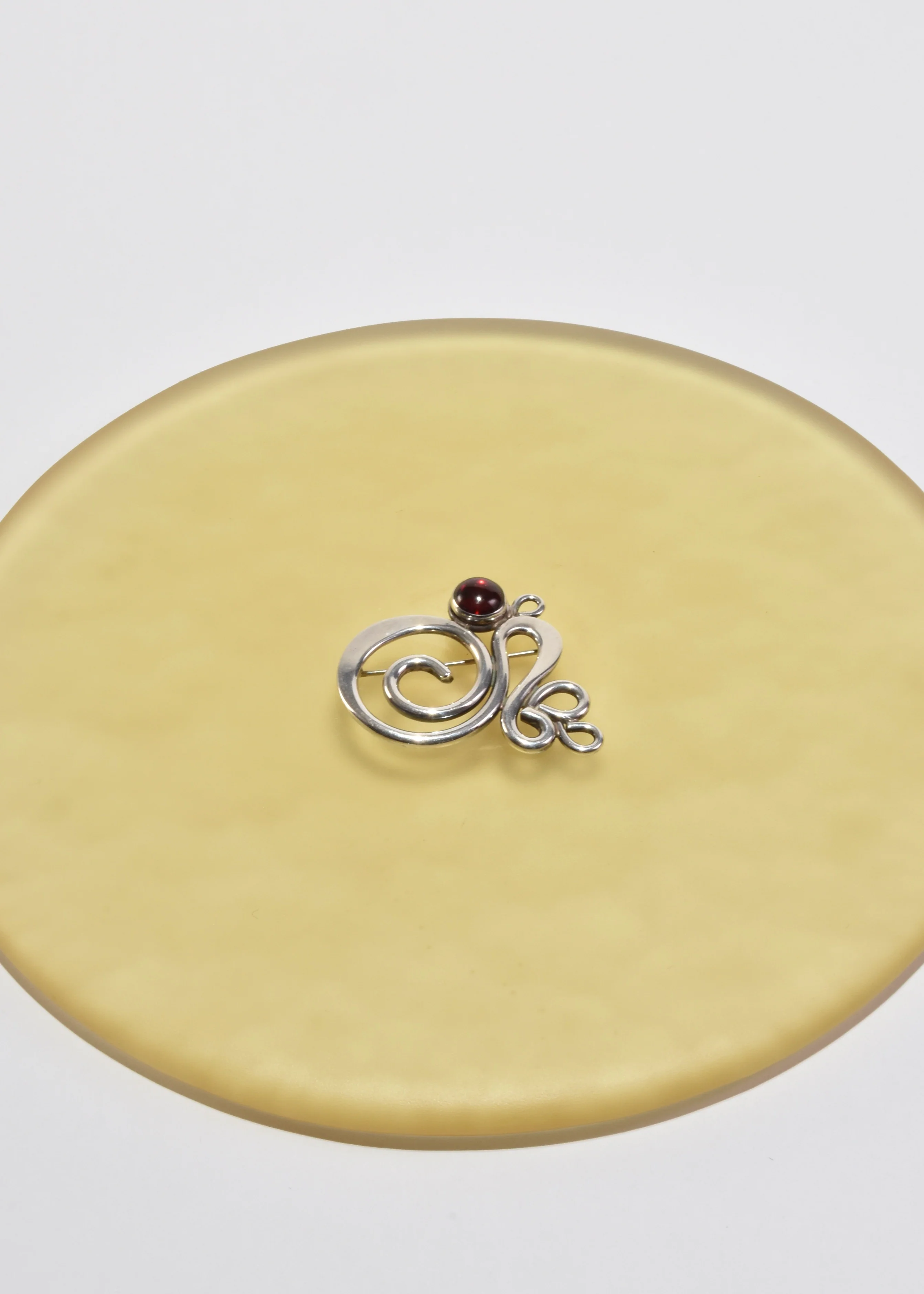 Rare, vintage sterling brooch in a sculptural design with a round garnet cabochon, pin-back closure. Stamped,ย Sterling TOW.