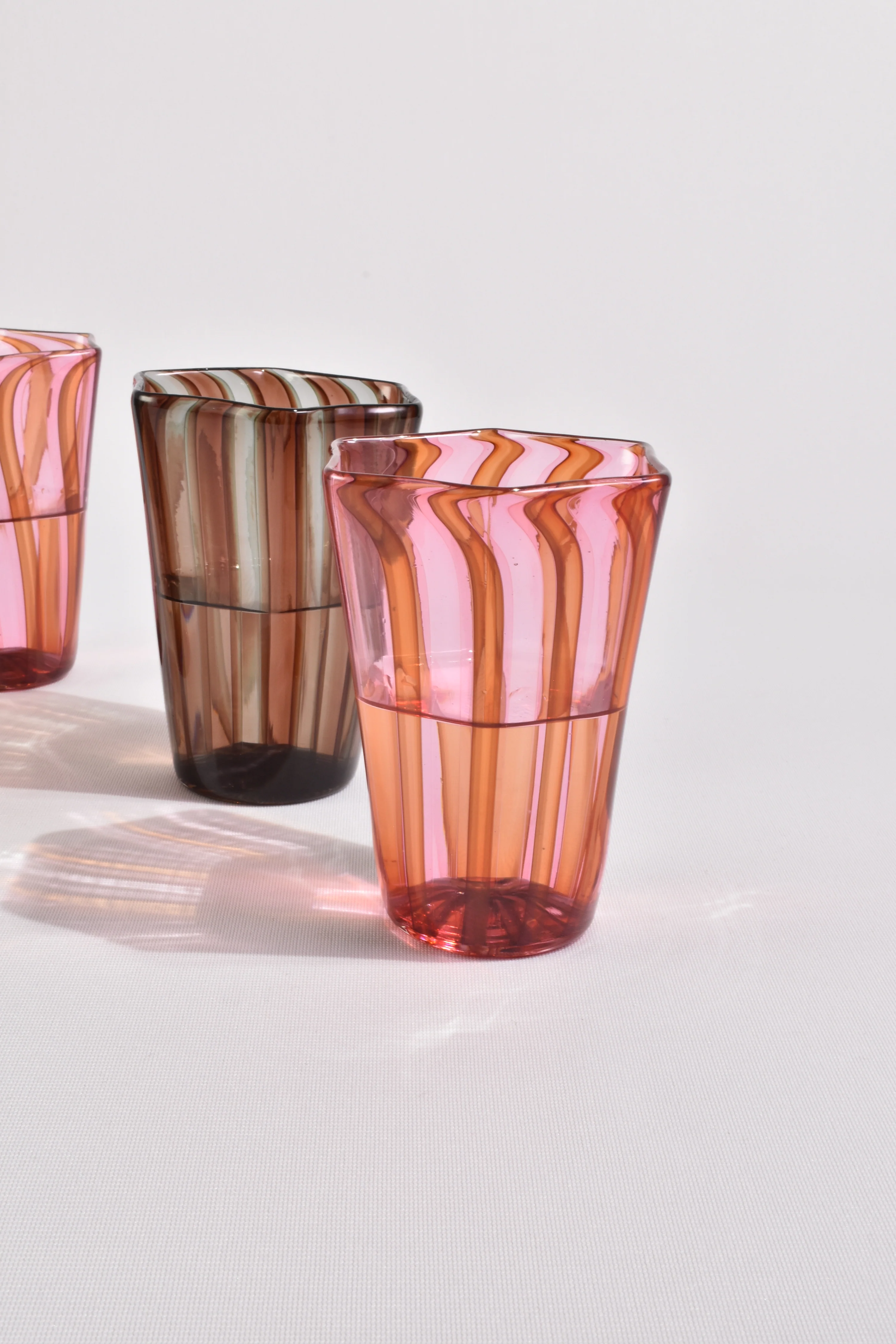 Our Venetian-inspired glass set brings together vibrant pink and orange stripes with a distinctive hexagonal rim and rounded base. Part of our new in-house collection, these tumblers pair modern hues with shapes inspired by Venetian glassware resulting in functional, beautiful pieces to be admired and used often. Designed for both daily use and aesthetic delight.