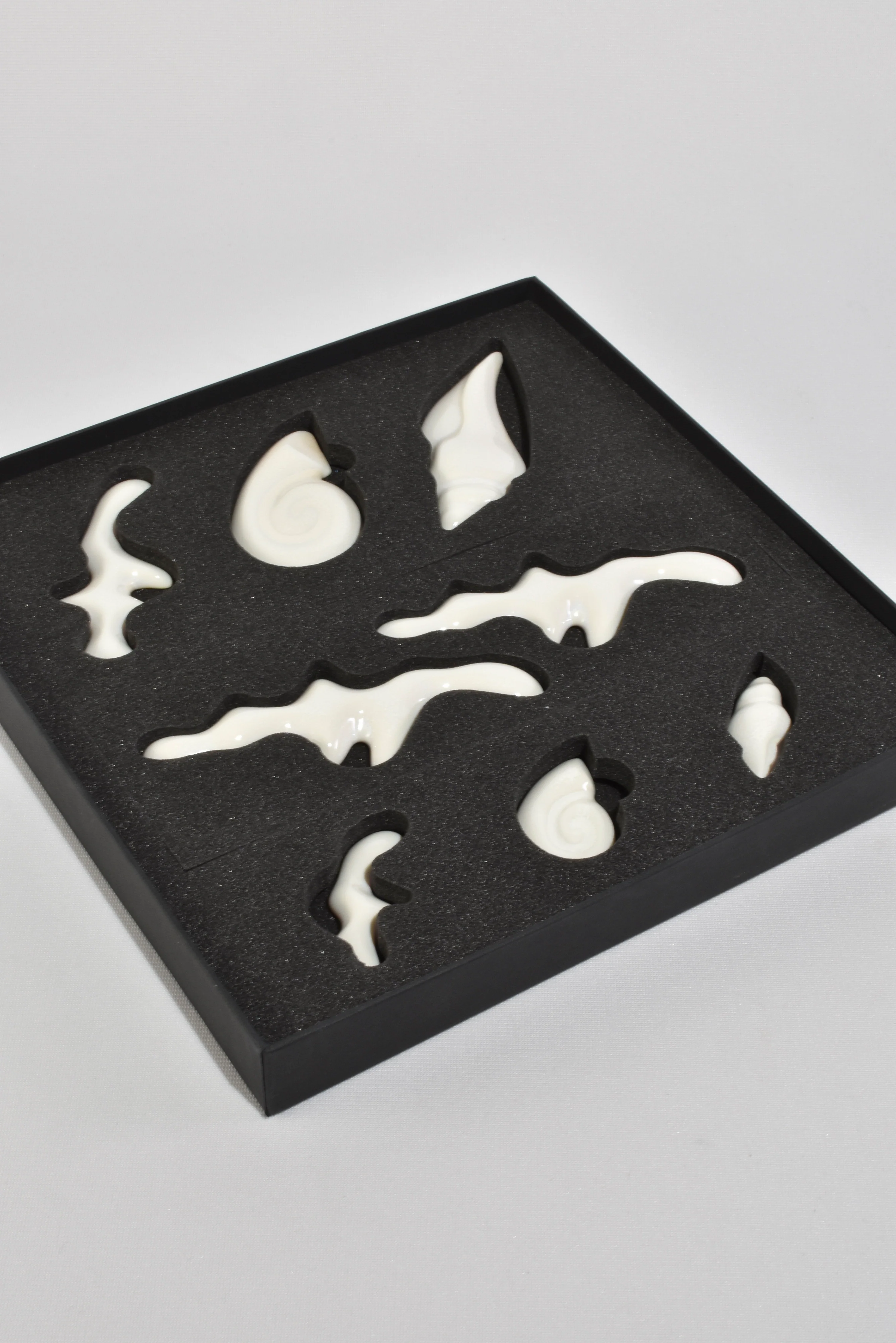 Beautiful ceramic shell cutlery rest gift set in a glossy white glaze. Set includes eight shell rests in various shapes and sizes, packaged in a gift box.