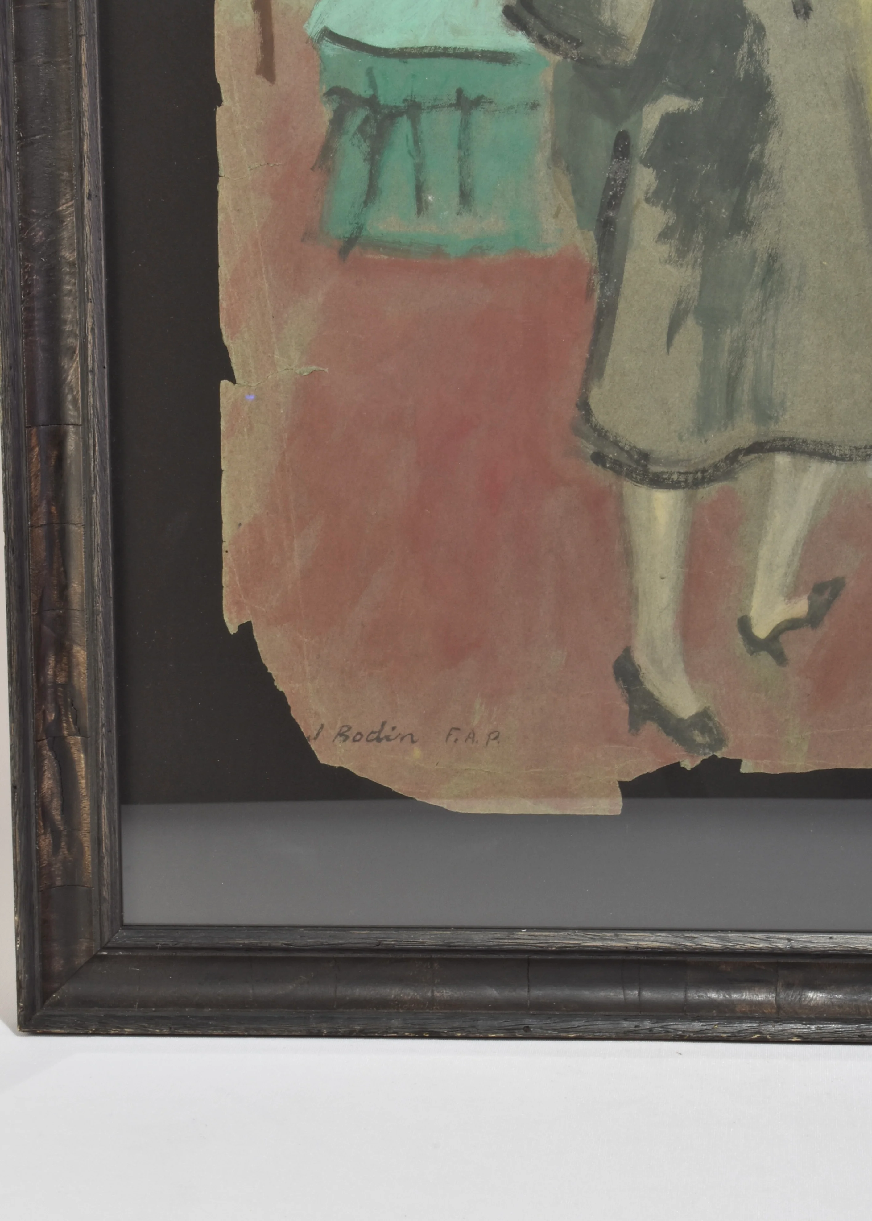 Gouache painting on paper by J. Bodin, signed lower left and annotated โF.A.P.โ for the Federal Art Project. The scene depicts a red-haired woman standing in a modest domestic interior, holding a small bowl of grapes. Stylized furniture and tonal contrasts evoke the quiet realism often associated with WPA-era work. The composition combines muted color fields with soft figural handling and an expressive, unfinished edge.
